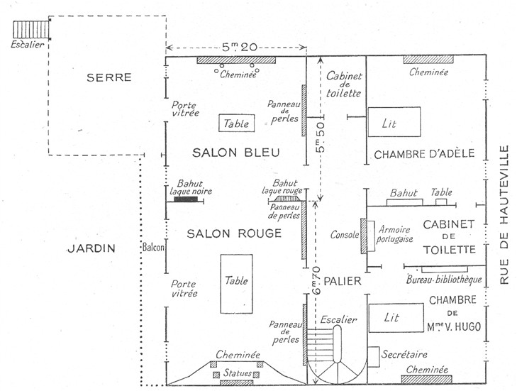 Un salon rouge et un salon bleu, Victor Hugo avait une mémoire visuelle prodigieuse, et le choix de cet ensemble fut influencé par un souvenir d'enfance. La décoration intérieure du Palais Masserano, où il vécut au début de son séjour à Madrid en 1811, avait produit une impression extraordinaire. Madame Hugo, dans son livre "Victor Hugo raconté par un témoin de sa vie" parle de son "éblouissement".