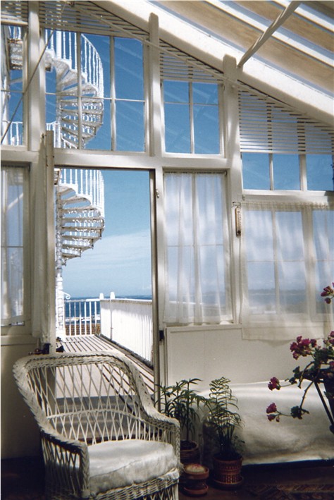 Petite pièce très gaie, remplie de lumière. Toute vitrée dont les meubles, à l'exception d'une table de chêne, sont tous en rotin blanc. Hugo venait souvent s'y reposer et lire.